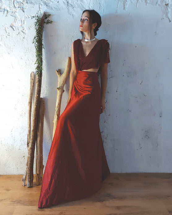 - Parte inferiore in raso con spacco e abbotonatura nascosta