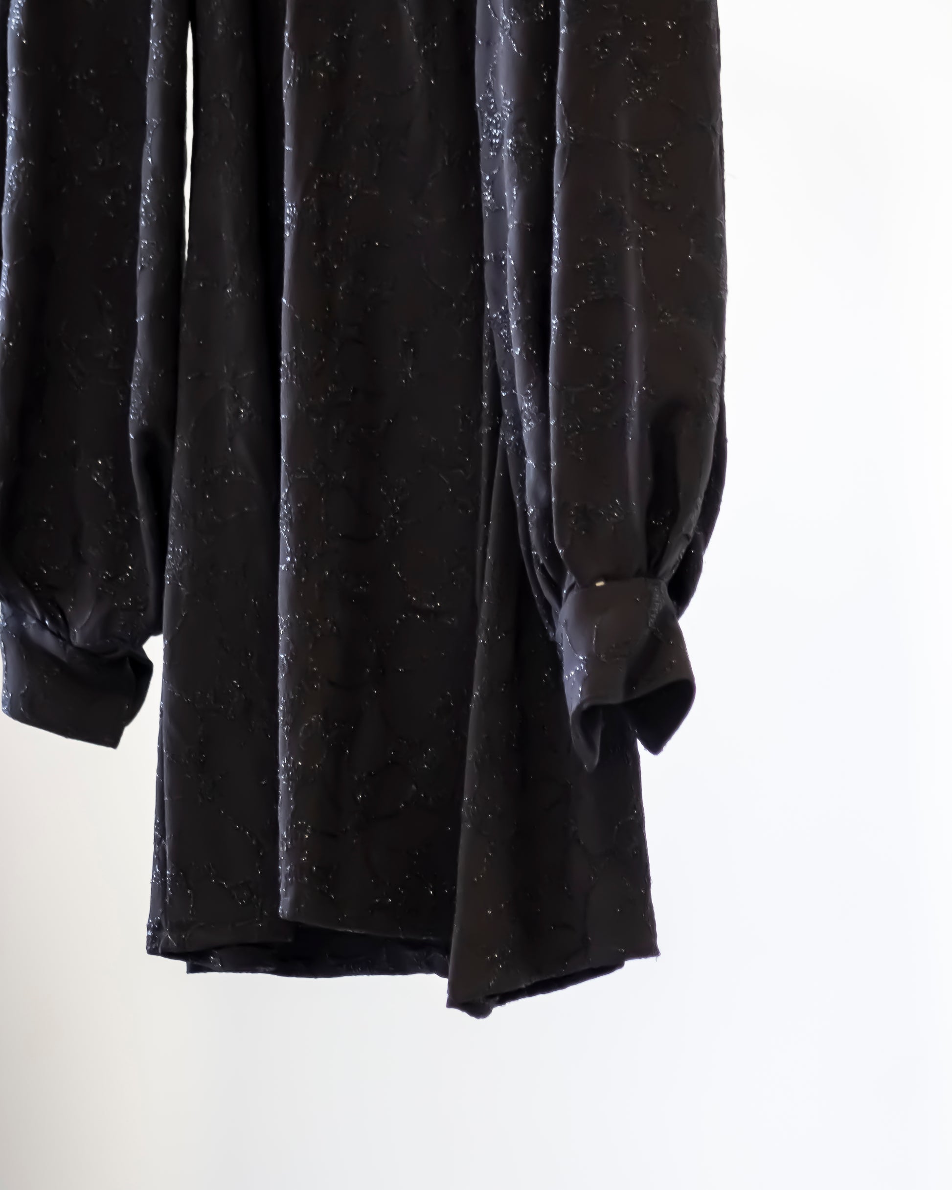 Il modello è leggermente svasato al fondo con maniche ballon e polsini.