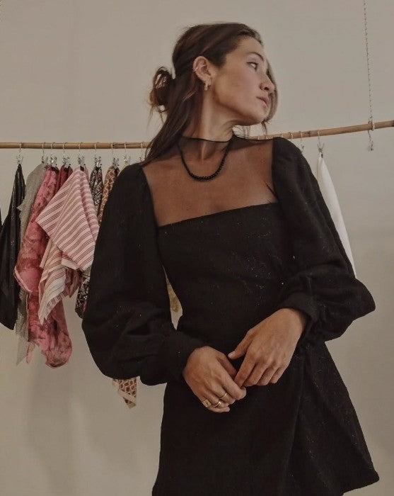 Mini abito creato con tessuto ricamato con filo metallico e inserti in tulle.