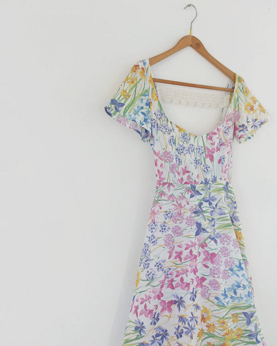 Abito da cerimonia in cotone leggero con stampa floreale multicolore.