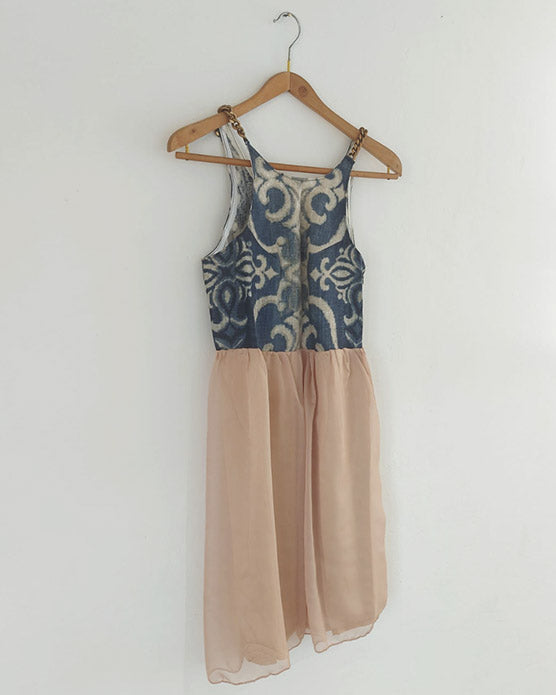 Mini abito in lino con stampa damascata e chiffon di poliestere.