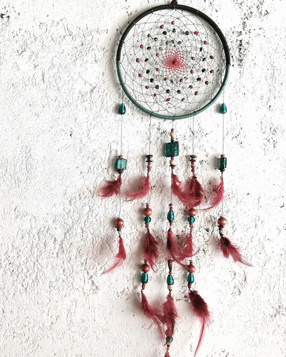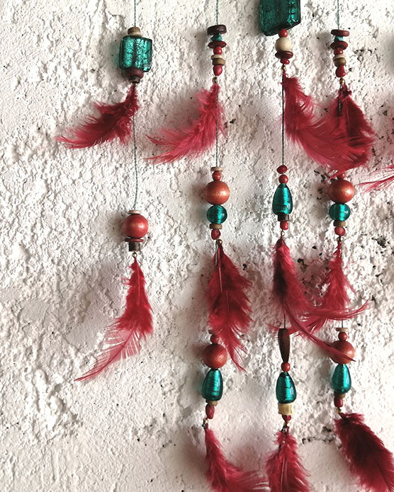 Materiali: Piume, Perline di vetro, Perline di legno, Perline di resina, Filo di cotone cerato.