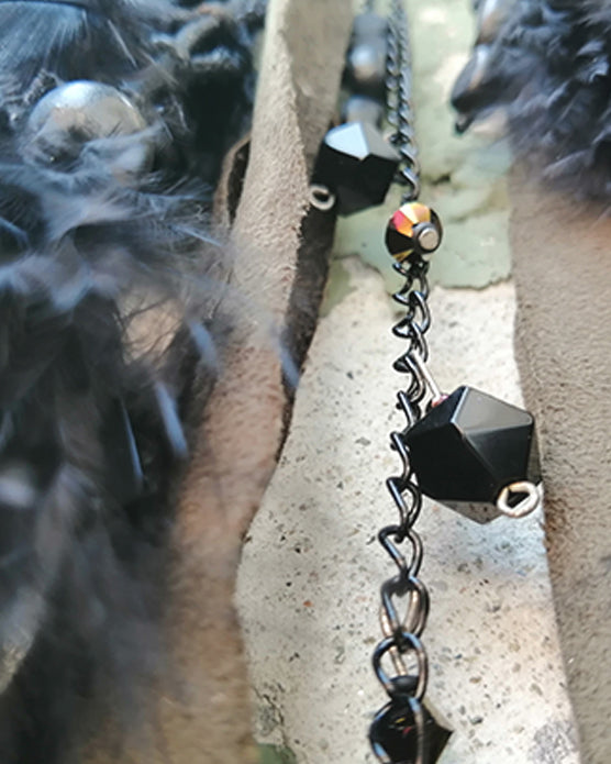 Materiali: Striscie di tessuto ecosuede, Piume, Perline di vetro, Perline di legno, Perline di plastica dura, Filo di cotone cerato, Fettuccia di alcantara, Catenella in acciaio