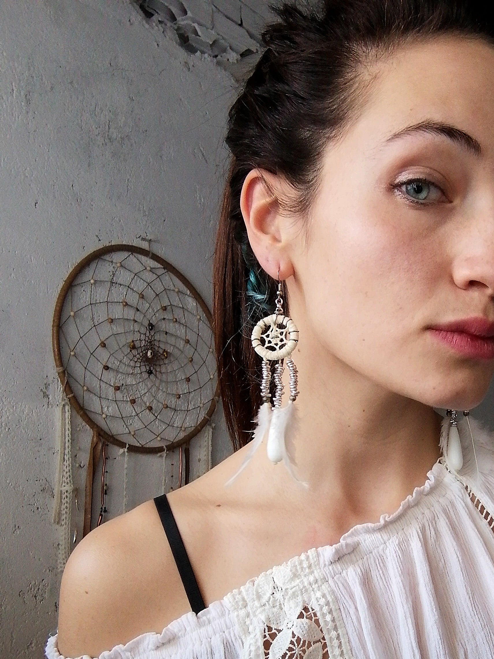 Materiali: Piume, Anellini metallici, Fettuccia di Alcantara, Monachelle Nickel Free, Pietra dura Agata