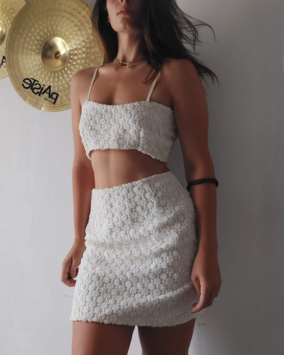 Set di minigonna e top in un bellissimo pizzo macramè ricamato con perline.