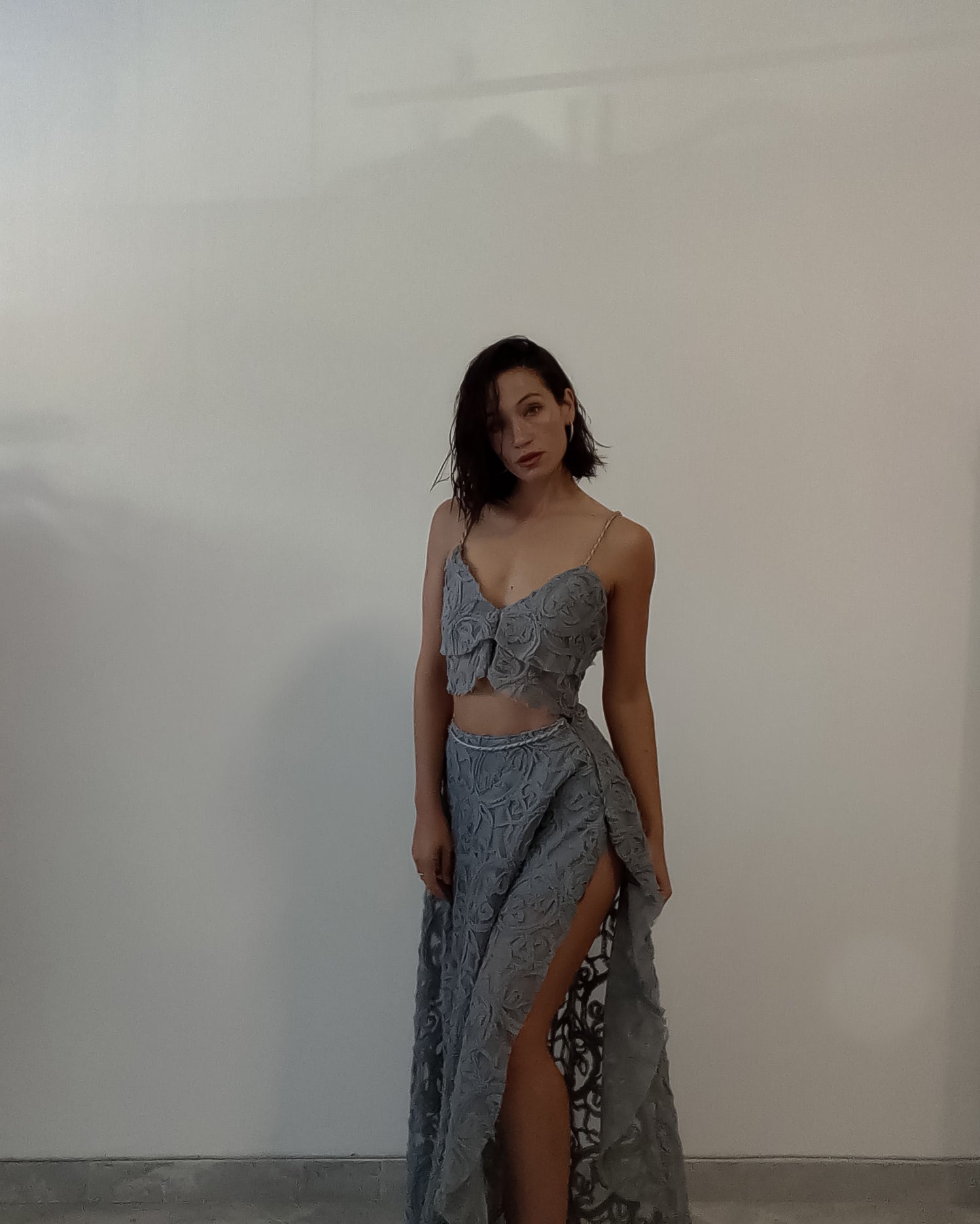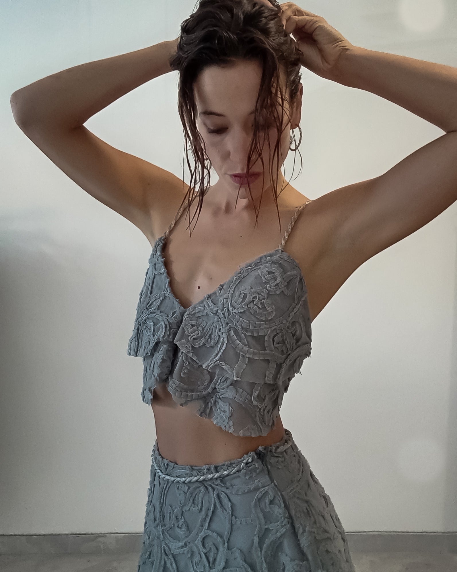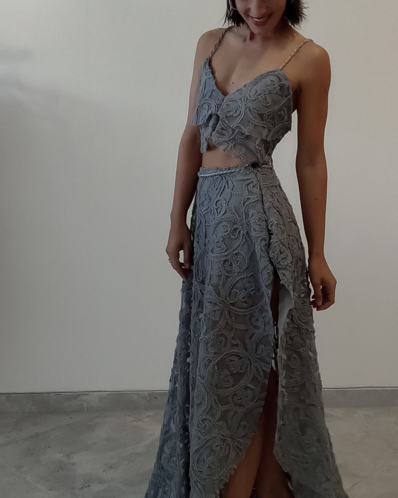 Top e Gonna in tessuto ricamato con dettagli metallici argentati.