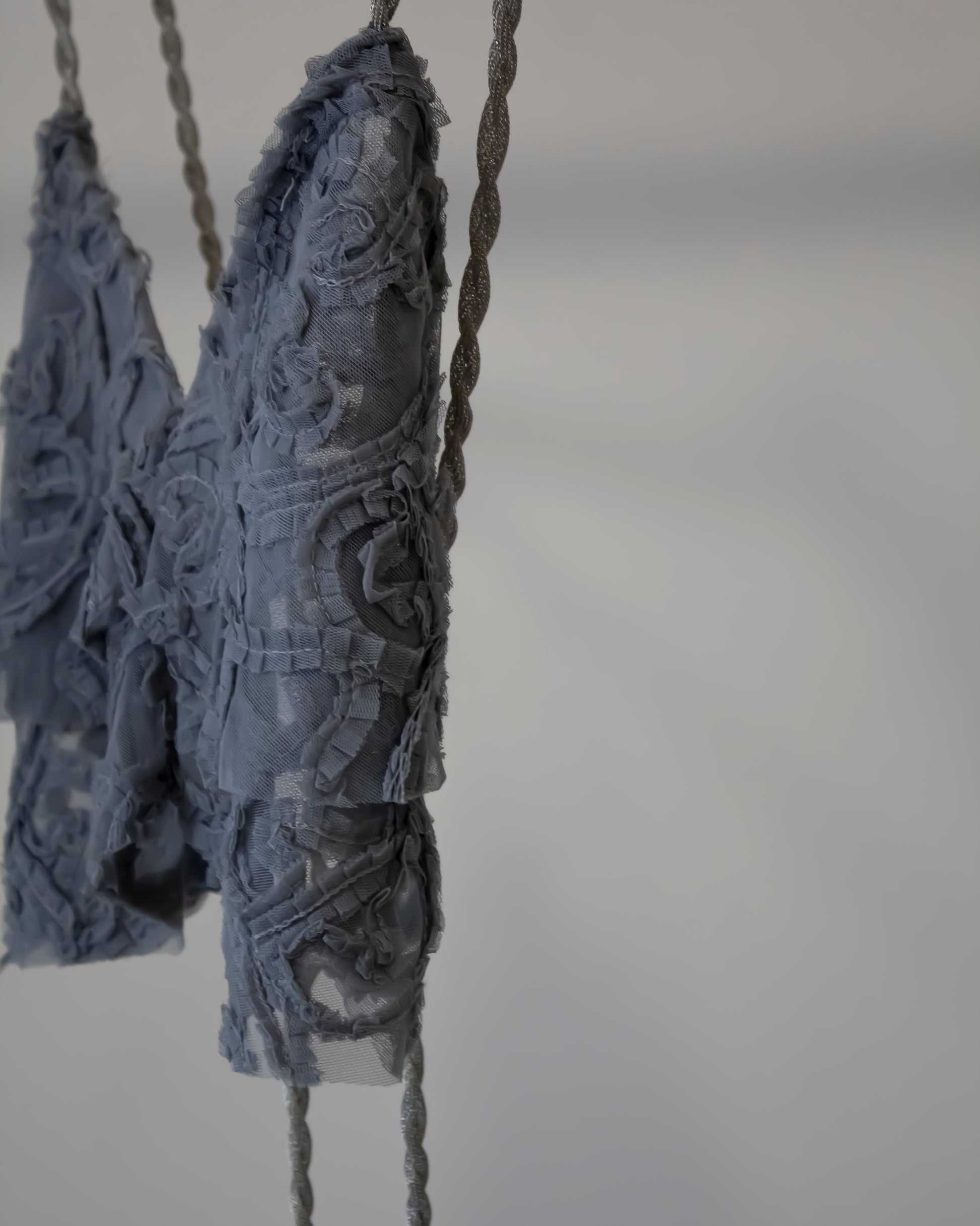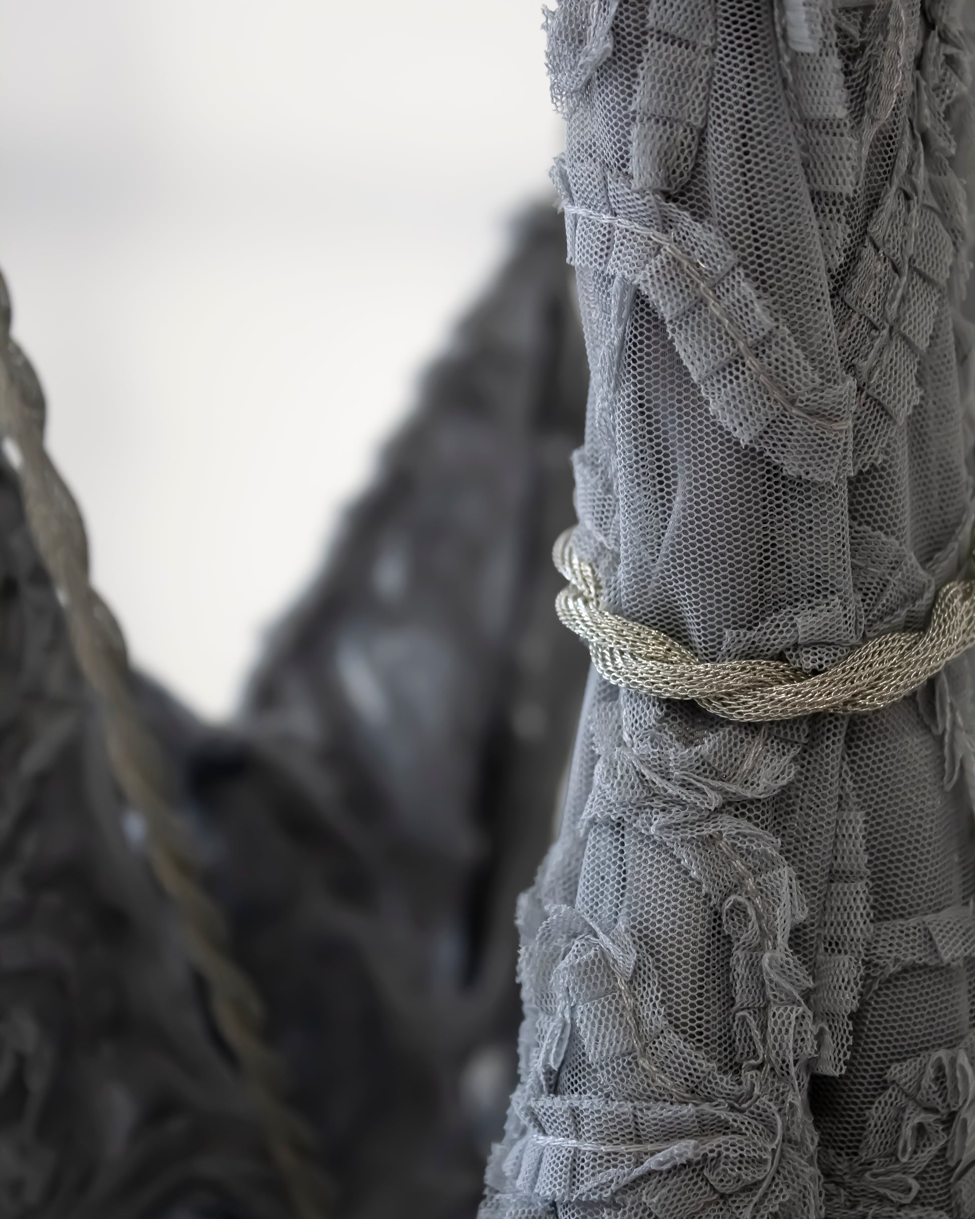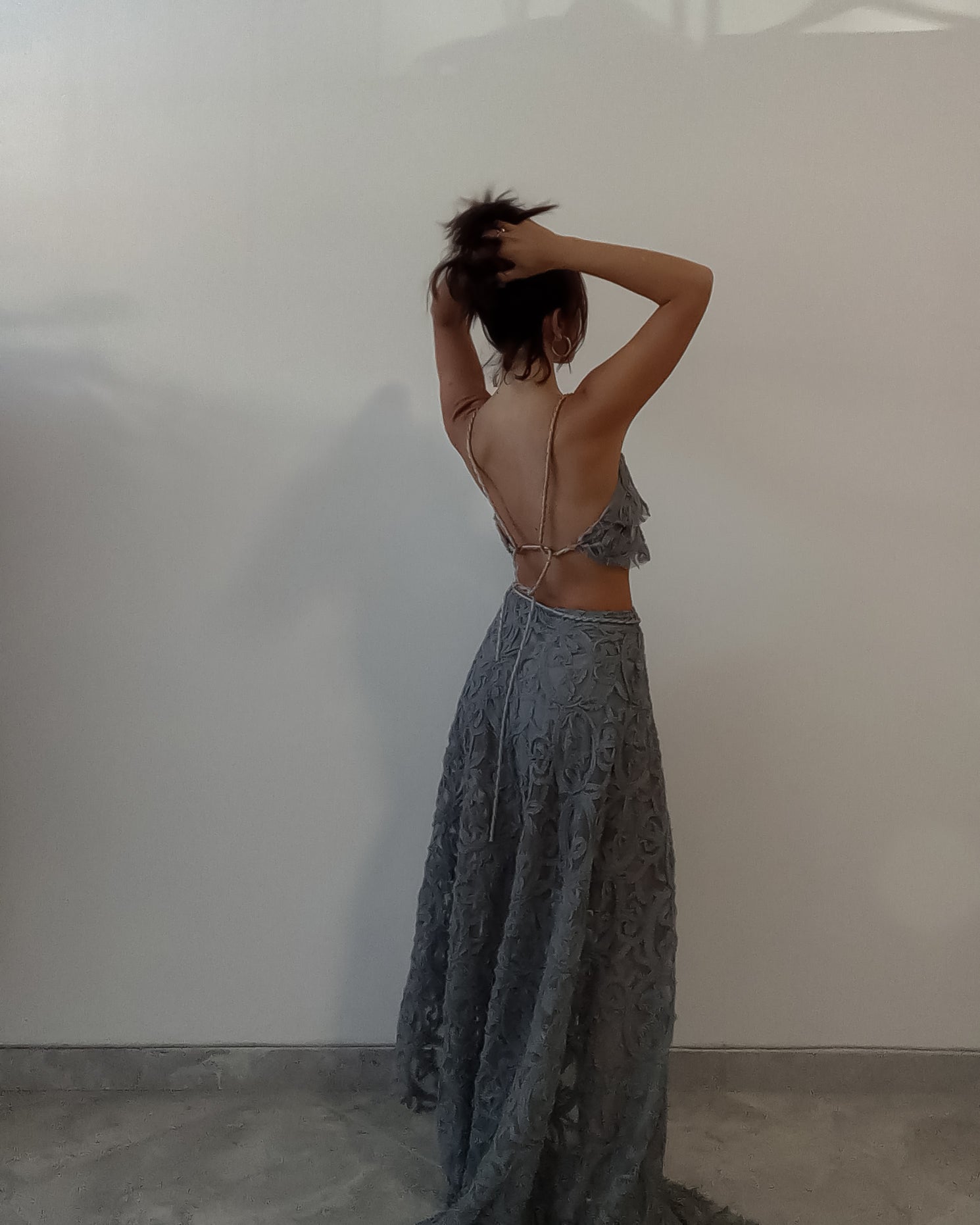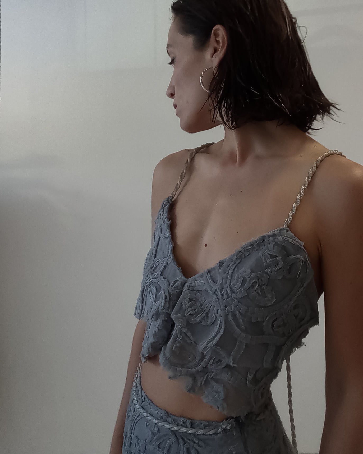 Top e Gonna in tessuto ricamato con dettagli metallici argentati.